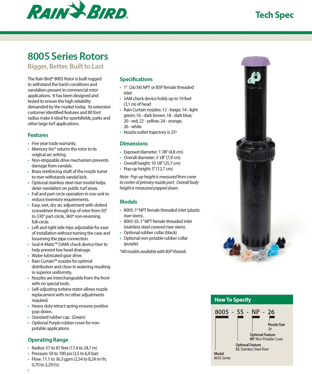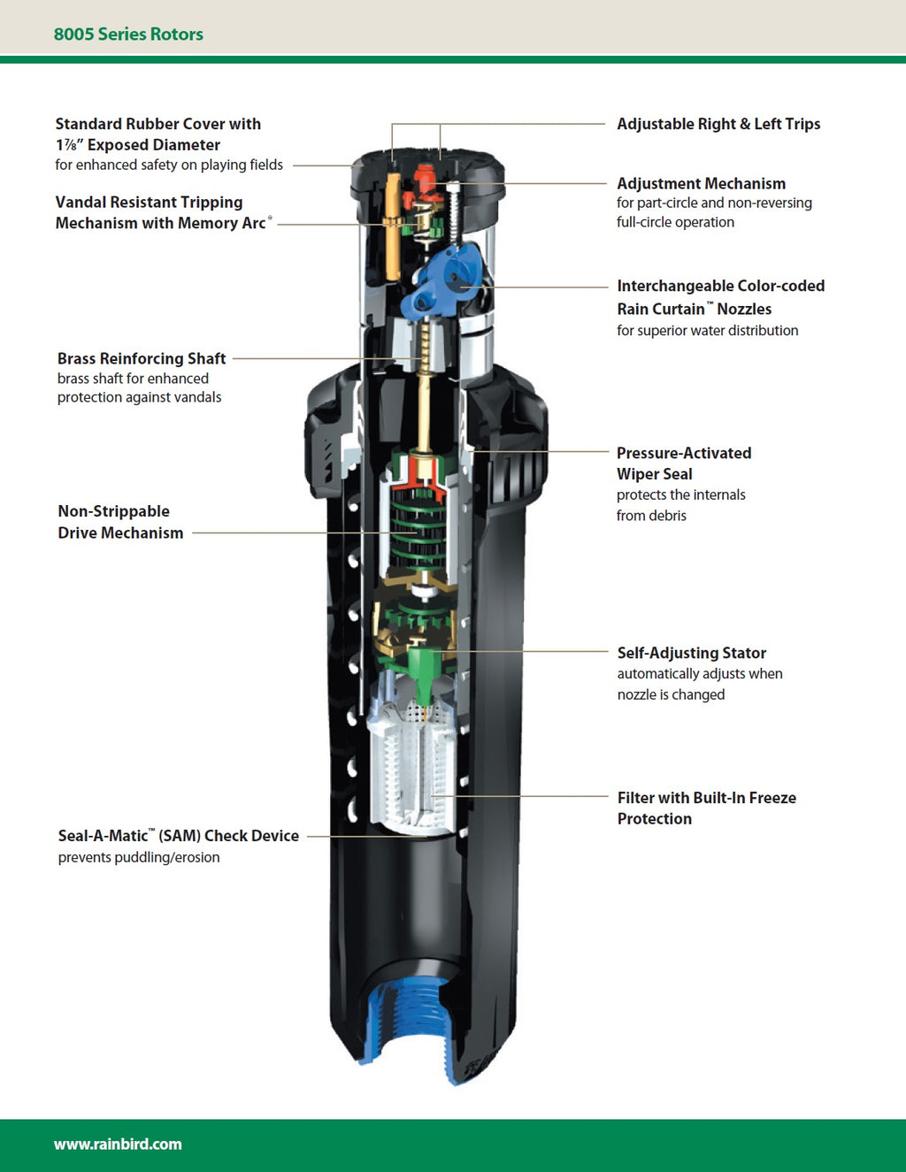 The Rain Bird® 8005 Rotor is built rugged to withstand the harsh conditions and vandalism present in commercial rotor applications. It has been designed and tested to ensure the high reliability demanded by the market today. With its extensive customer identified features, it is versatile enough to fit all applications. The Rain Bird® 8005 Rotor, with its extensive customer identified features and 80 foot radius, is ideal for watering sports fields, parks, and other large turf applications.