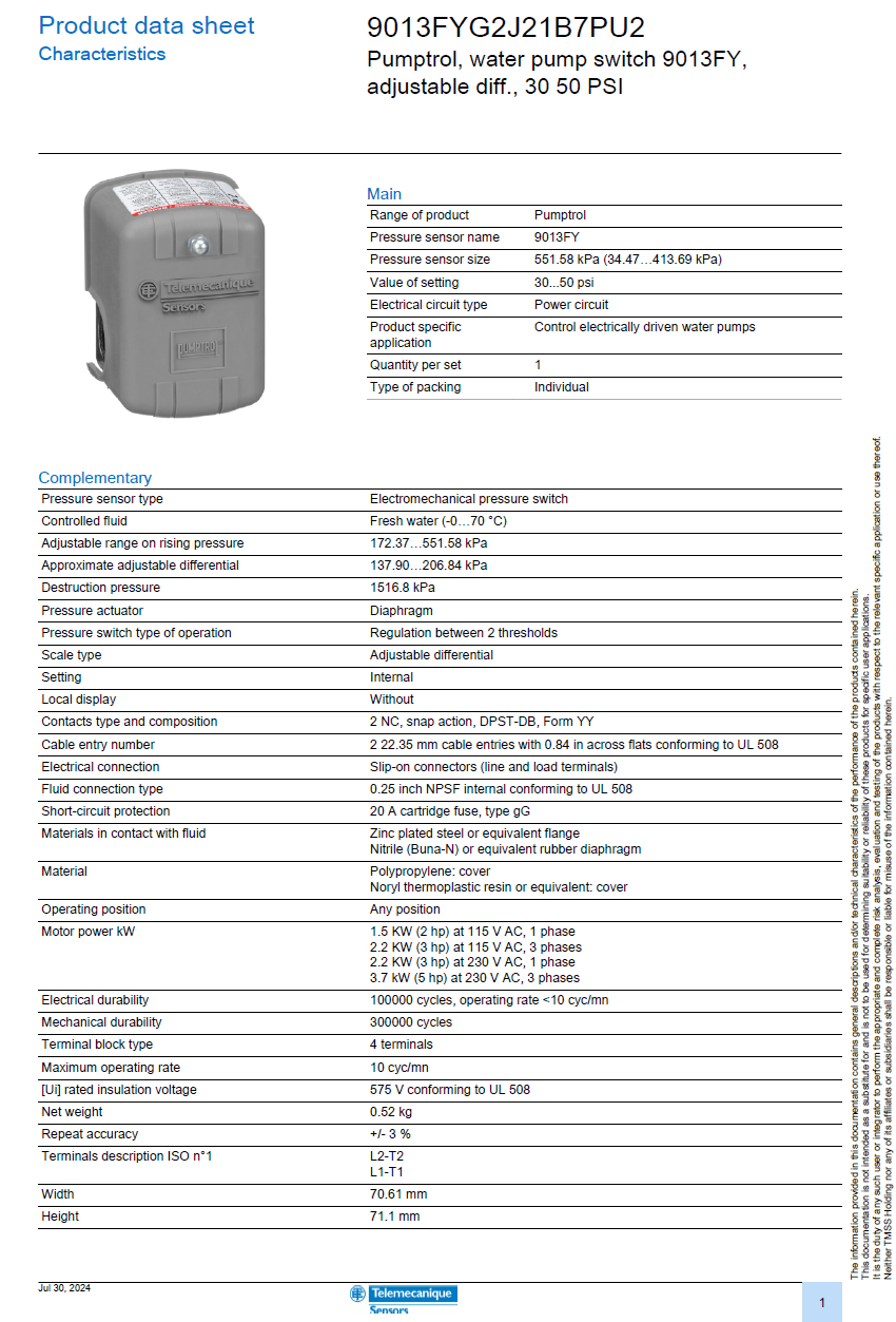 - Pressure sensor type: Electromechanical pressure switch