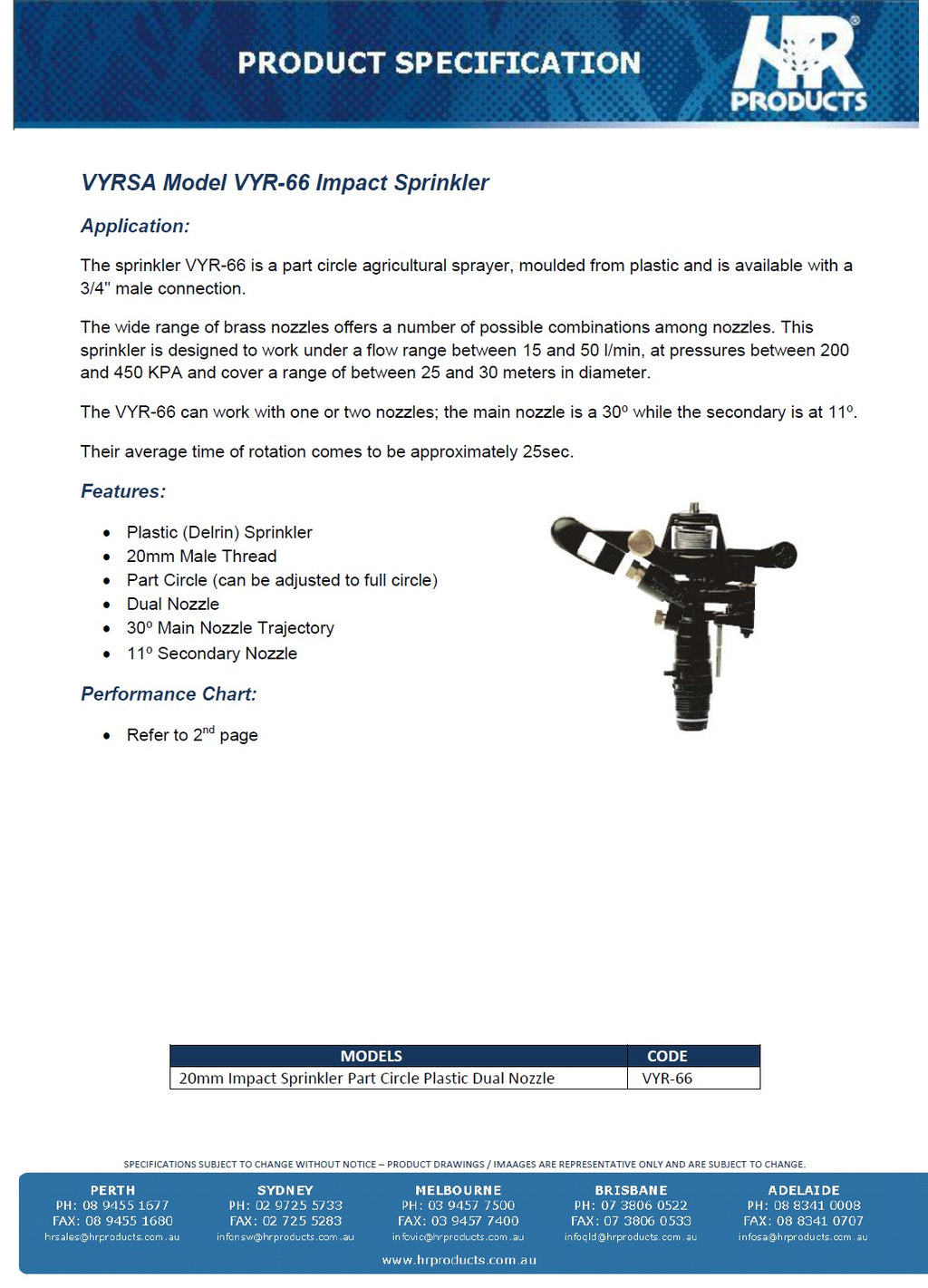 3/4" Plastic Impact Sprinkler on Heavy Duty Base - Suitable for large lawn areas. The sprinkler VYR-66 is a part circle agricultural sprayer, moulded from plastic and is available with a 3/4" male connection.