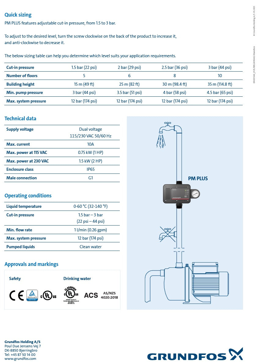 Grundfos PM2 PLUS Pressure Manager Pump Controller - The PM PLUS is the all-round control solution, offering adjustable pump start at 1.5 to 3 bar. This enables customisation to different types of installation and desired comfort levels. The start pressure is set inside the unit. The PM2 starts the pump when the starting pressure is reached and keeps running as long as there is flow. It is equipped with an internal pressure tank to minimise starts and stops in the event of leakage in the installation. In addition, the PM PLUS can be optimised for operation with a large external pressure tank by enabling the 1-bar differential pressure function. This significantly reduces the number of operating hours of the pump in installations with a pressure tank. The PM PLUS is also suitable for use on generators.
