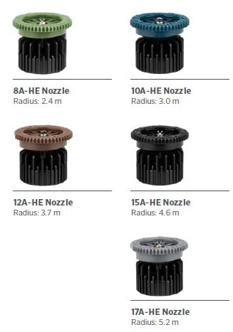 Pro High-Efficiency Nozzles provide increased efficiency for traditional spray systems. They achieve this by providing high uniformity from the spray pattern at a matched precipitation rate across the line. A step up from Hunter Pro Adjustable Nozzles, the Pro High-Efficiency Nozzles offer lower flows for the 2.4 m and 3.0 m nozzles and matched precipitation from 2.4 m to 5.2 m across the 0° to 360° adjustable arc range. Pro High-Efficiency Nozzles share the same thick, coined nozzle top for easy arc adjustment in the field and full shutoff capability. With a clear left edge indicator on the top of the nozzle and a flat section on the nozzle base for the right edge indicator, it’s easy to locate and set the spray pattern. The Pro High-Efficiency Nozzles offer quicker, easier installation with high uniformity performance from a spray nozzle.